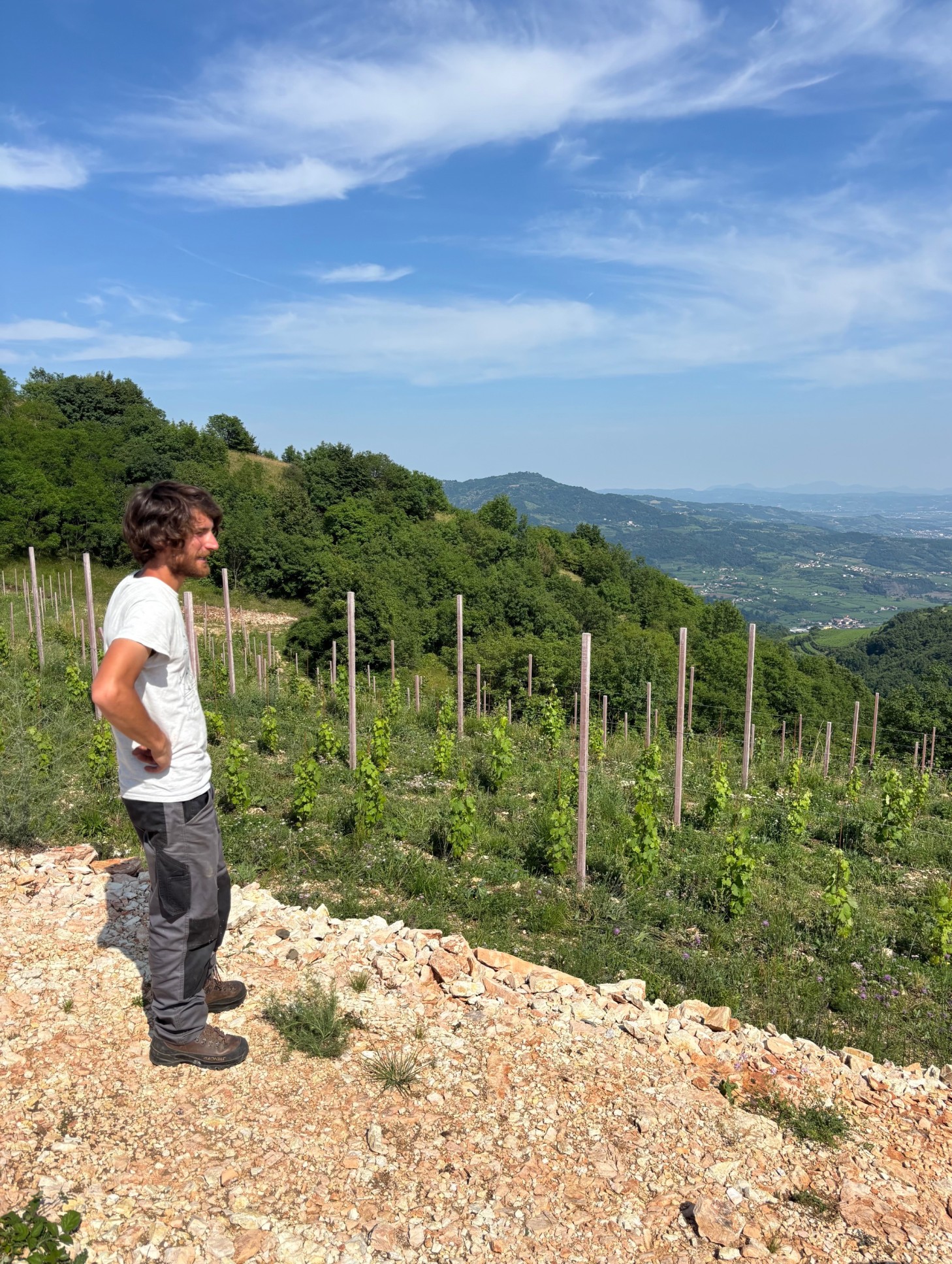 Originally from Venezia and Milano respectively, the couple met during a work placement on the Friuli’s western hills. Alessandro studied viticulture and enology in Udine, and after a vintage spent in a winery in Bordeaux, he returned to Veneto to build a family with Francesca. In 2021, the couple settled on the picturesque hills between the Val Tramigna and the Val d’Alpone in Eastern Veneto, where they have planted three plots between six and seven hundred meters above sea level. An enchanting landscape, shaped by both sedimentary and igneous soils, where the Mediterranean climate is mitigated by the proximity of the Lessini Mountains.